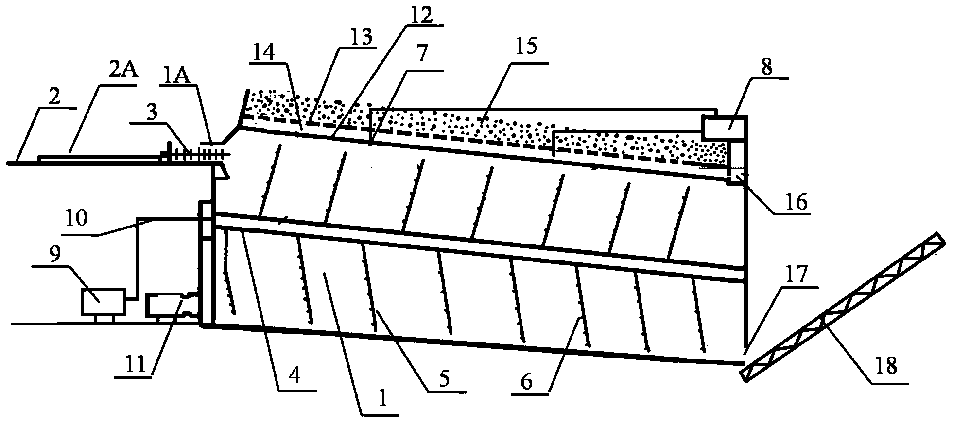 本發(fā)明公開(kāi)了一種推移式污泥連續(xù)好氧發(fā)酵系統(tǒng)及其應(yīng)用方法,包括發(fā)酵倉(cāng)、進(jìn)料裝置、供氣裝置、物料攪拌和推移裝置、廢氣凈化裝置及出料裝置,應(yīng)用時(shí)將待處理的污水處理剩余污