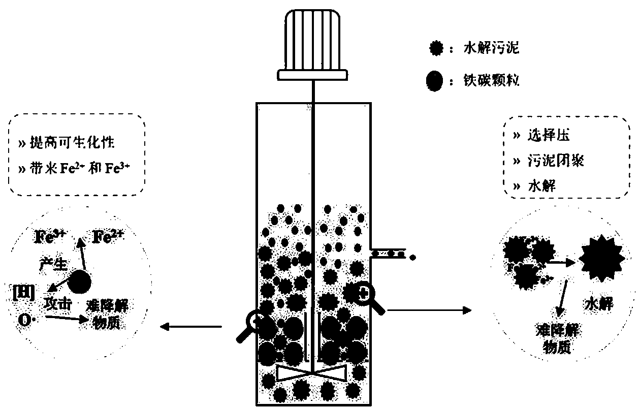 本發(fā)明公開(kāi)了鐵碳和水解顆粒污泥耦合預(yù)處理難降解污水技術(shù),該工藝采用鐵碳和水解顆粒污泥耦合預(yù)處理技術(shù),具體操作步驟為在水解池內(nèi)增加固定層,固定層內(nèi)投加一定量鐵碳,水