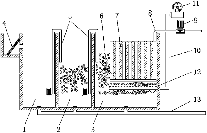 生活一體化污水設(shè)備 :本實(shí)用新型涉及污水處理技術(shù)領(lǐng)域,具體為帶有二級(jí)分解池的污水MBR一體化處理設(shè)備,包括依次連通的調(diào)節(jié)池、預(yù)處理池、MBR反應(yīng)池,調(diào)節(jié)池上端設(shè)有格柵,調(diào)節(jié)
